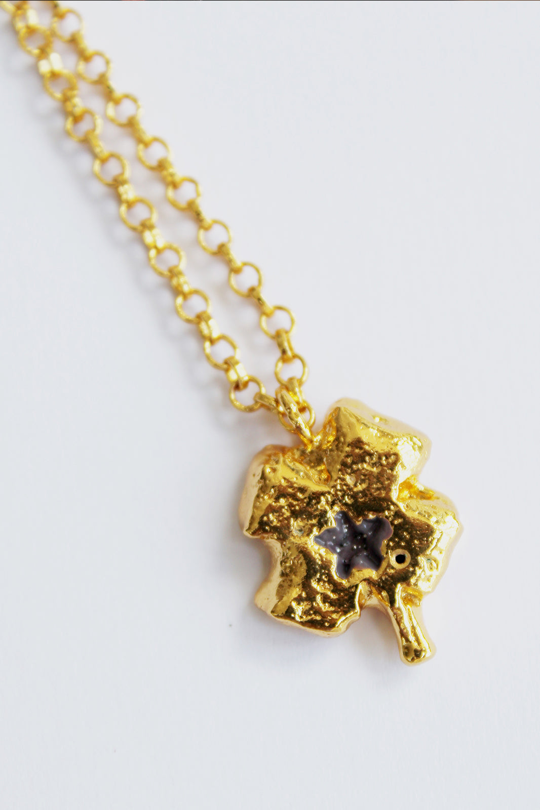 Cadena de bronce con baño de oro, acompañada por un delicado dije en forma de trébol con detalle de estrella. Cada elemento ha sido elaborado, labrado y martillado a mano, reflejando la esencia del trabajo artesanal y la sutileza de los símbolos que evocan fortuna y luz interior. Una joya con alma, pensada para brillar con intención.